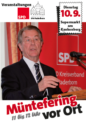 Anschließend geht es gegen 12.30 Uhr in die Paderborner Innenstadt. Nach einem kleinen Imbiss wird Franz Müntefering, begleitet von Burkhard Blienert, durch die Fußgängerzone ziehen und dort ebenfalls das Gespräch mit den Menschen suchen.